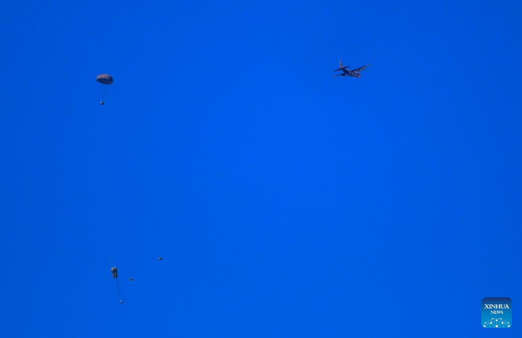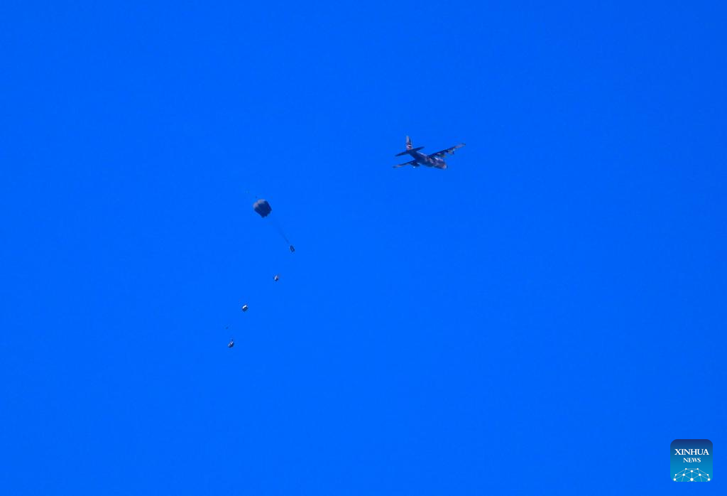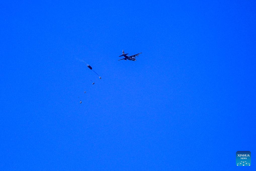 An Egyptian military plane drops humanitarian aid over the southern Gaza Strip, on Feb. 27, 2024. Egyptian air forces dropped humanitarian aid to the Gaza Strip on Tuesday, Al-Qahera News TV said. (Photo by Yasser Qudih/Xinhua)