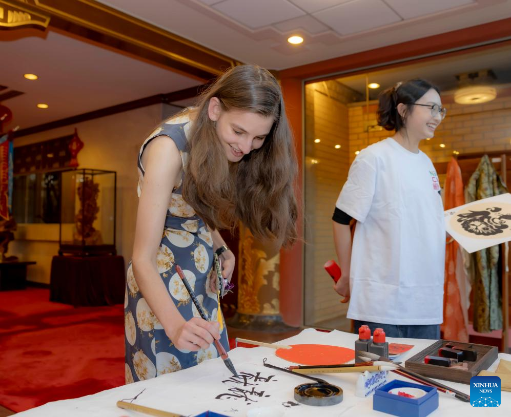 An Australian guest tries Chinese calligraphy during the China Culture Day held in the Chinese Embassy in Australia in Canberra, Australia, on Feb. 27, 2024. China Culture Day of 2024, a cultural exchange event themed "Amazing Xi'an Ancient Capital," was held by the Chinese Embassy in Australia on Tuesday. Artists from Xi'an were invited to showcase the richness of Chinese culture, including Chinese calligraphy, seal carving, dances, music and magic shows, among others. (Photo by Chu Chen/Xinhua)