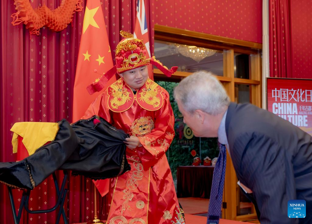 An artist from Xi'an performs a magic show during the China Culture Day held in the Chinese Embassy in Australia in Canberra, Australia, on Feb. 27, 2024. China Culture Day of 2024, a cultural exchange event themed "Amazing Xi'an Ancient Capital," was held by the Chinese Embassy in Australia on Tuesday. Artists from Xi'an were invited to showcase the richness of Chinese culture, including Chinese calligraphy, seal carving, dances, music and magic shows, among others. (Photo by Chu Chen/Xinhua)
