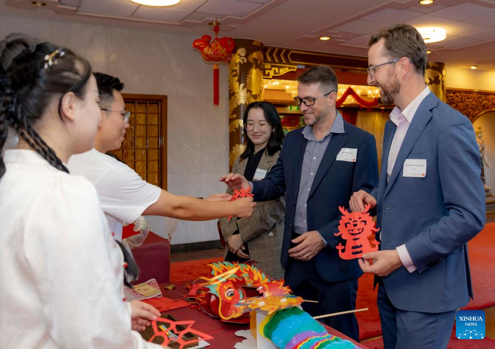 Australian guests learn about the art of Chinese paper-cutting during the China Culture Day held in the Chinese Embassy in Australia in Canberra, Australia, on Feb. 27, 2024. China Culture Day of 2024, a cultural exchange event themed "Amazing Xi'an Ancient Capital," was held by the Chinese Embassy in Australia on Tuesday. Artists from Xi'an were invited to showcase the richness of Chinese culture, including Chinese calligraphy, seal carving, dances, music and magic shows, among others. (Photo by Chu Chen/Xinhua)