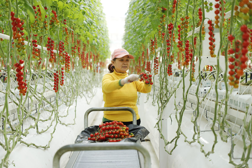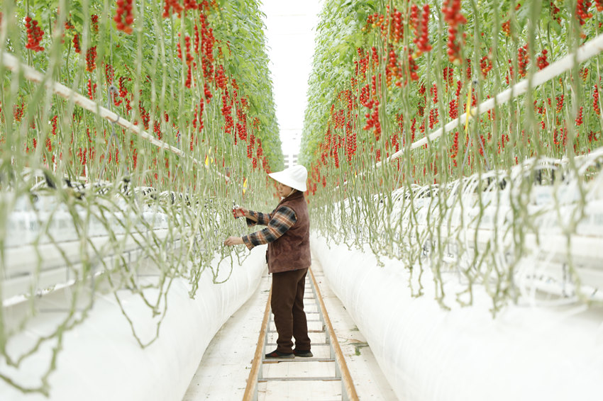 A worker harvests cherry tomatoes in an intelligent greenhouse of the circular agriculture park inside the China-France Agricultural Science and Technology Park in Jiangling township, Nanchong city, southwest China's Sichuan Province, on Feb. 19, 2024. (Photo/Yang Bo)