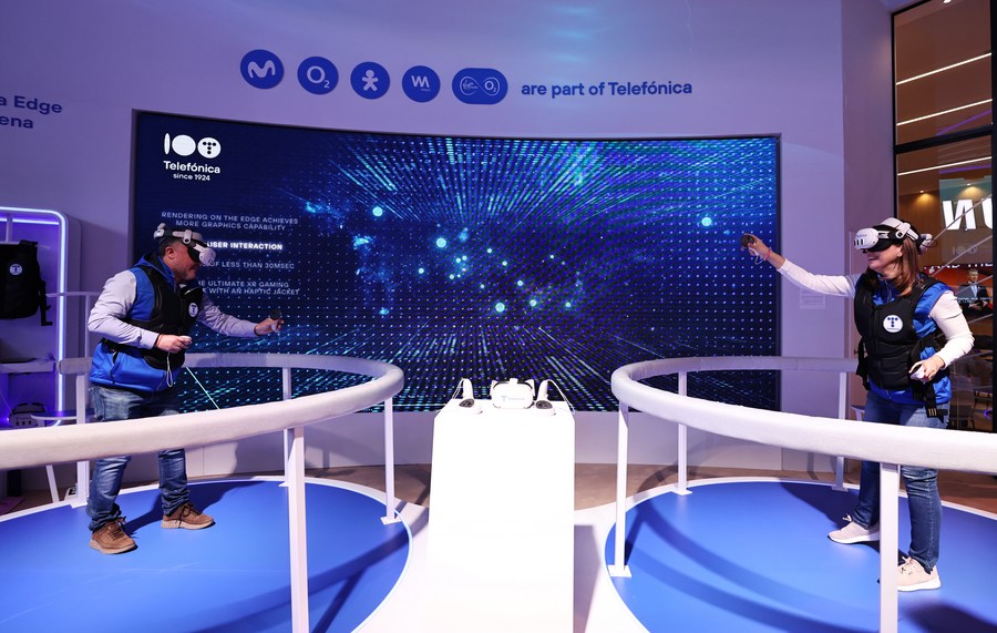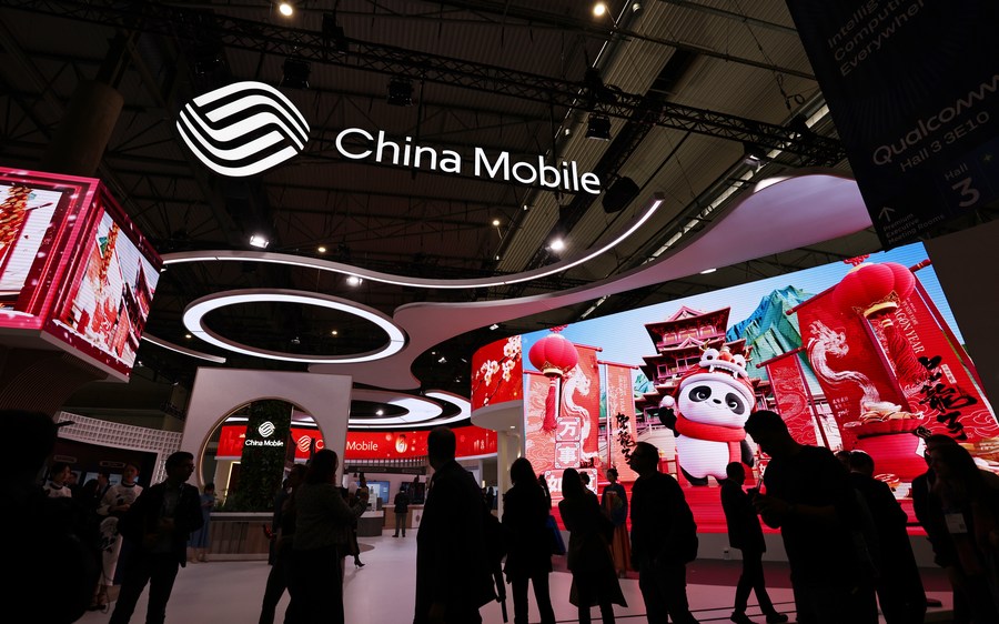 People visit the China Mobile pavilion at the 2024 edition of the Mobile World Congress (MWC) in Barcelona, Spain, Feb. 26, 2024. (Xinhua/Gao Jing)