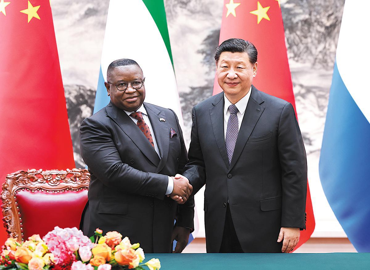 President Xi Jinping shakes hands with visiting Sierra Leonean President Julius Maada Bio during their meeting at the Great Hall of the People in Beijing on Wednesday. FENG YONGBIN / CHINA DAILY