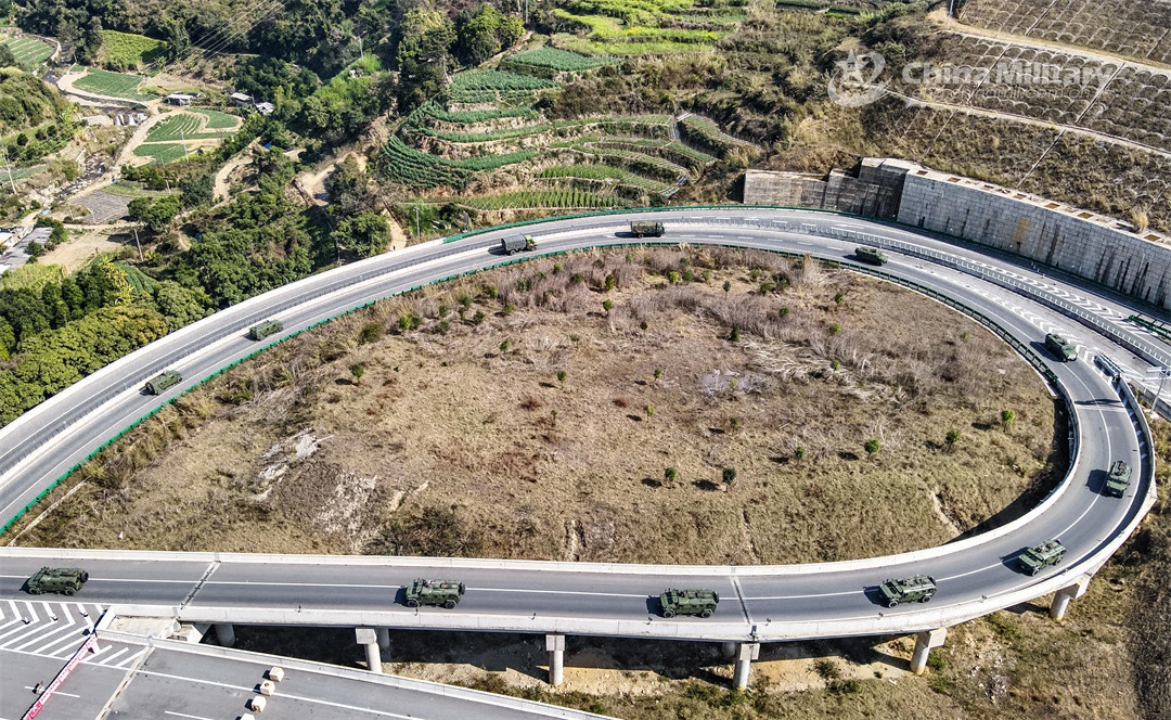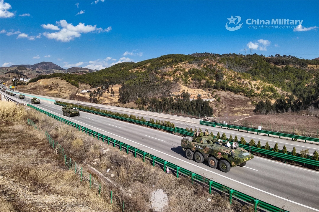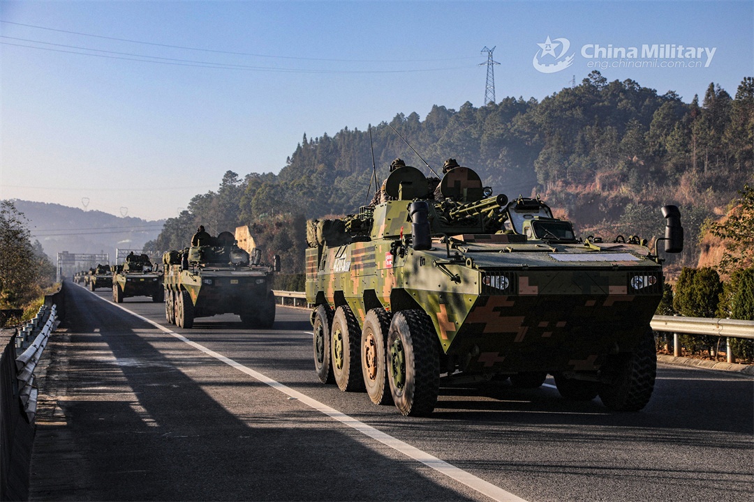 Armored vehicles attached to a brigade under the PLA 75th Group Army speed along an intercity highway during a long-distance maneuver training exercise in early February, 2024. (eng.chinamil.com.cn/Photo by Liu Junlei)