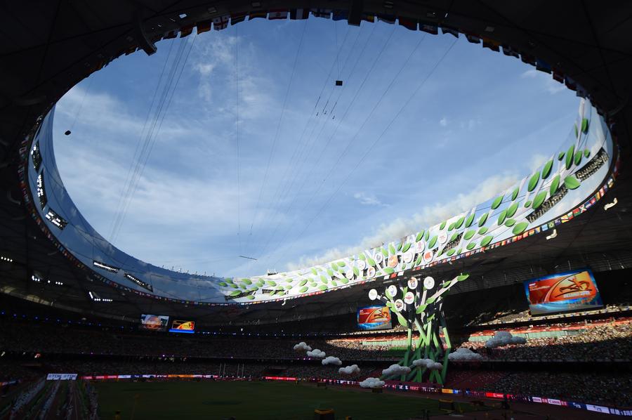 Photo taken on Aug. 22, 2015 shows the opening ceremony for the World Athletics Championships in Beijing. (Xinhua/Wang Haofei)