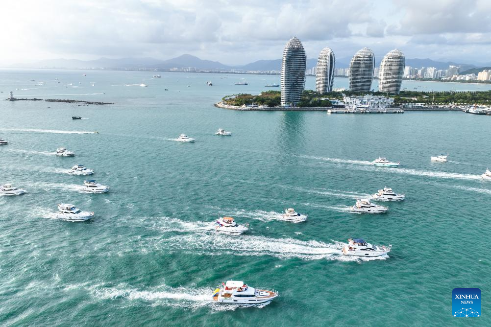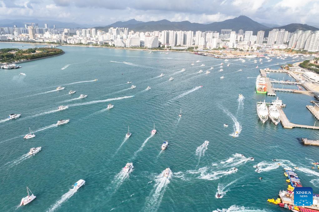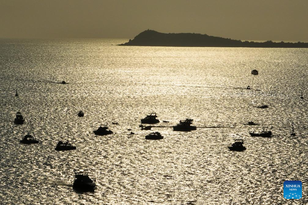 An aerial drone photo taken on Feb. 28, 2024 shows yachts riding the waves in Sanya, south China's Hainan Province. (Xinhua/Zhang Liyun)