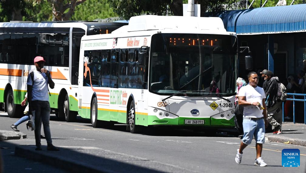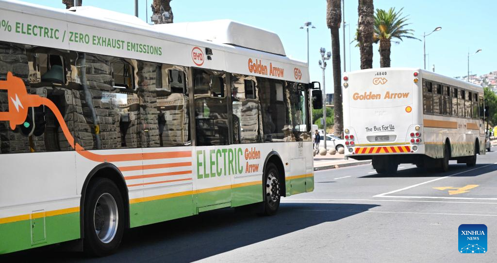 A BYD electric bus (front) runs on a road in Cape Town, South Africa, Feb. 28, 2024. China-made electric buses have been incorporated into the day-to-day operations of Golden Arrow Bus Services here. (Photo by Xabiso Mkhabela/Xinhua)