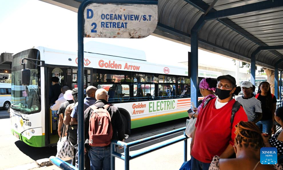 Passengers board a BYD electric bus in Cape Town, South Africa, Feb. 28, 2024. China-made electric buses have been incorporated into the day-to-day operations of Golden Arrow Bus Services here. (Photo by Xabiso Mkhabela/Xinhua)