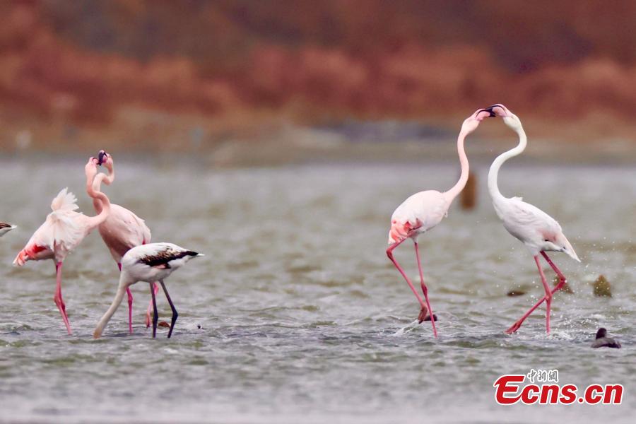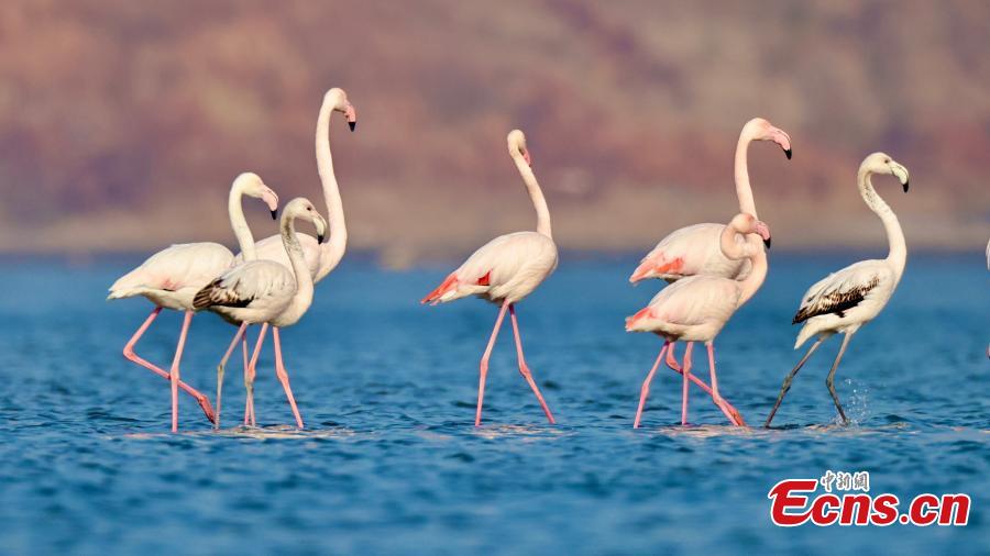 Flamingos were first spotted at the Tiaozini Wetland in 2015. By the end of 2023, the number of migrated flamingos had been recorded for nine consecutive years, which rose from one to 14.