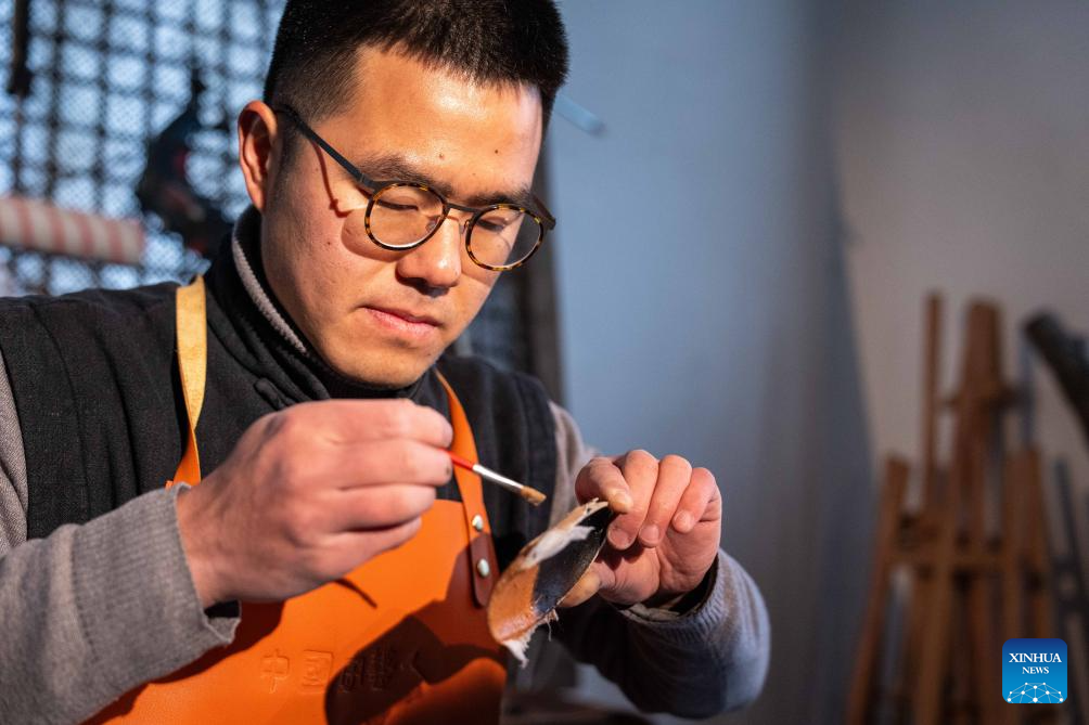 Hao Guanxiong makes an artwork at his studio in Changsha, central China's Hunan Province, Feb. 28. 2024. (Xinhua/Chen Sihan)