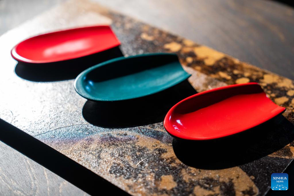 Lacquer coated artworks are displayed at Hao Guanxiong's studio in Changsha, central China's Hunan Province, Feb. 28. 2024. (Xinhua/Chen Sihan)