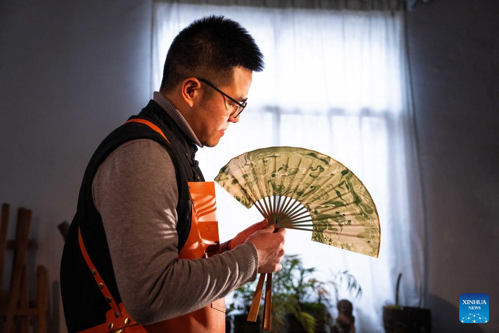 Hao Guanxiong dries lacquer coated fans at his studio in Changsha, central China's Hunan Province, Feb. 28. 2024. (Xinhua/Chen Sihan)