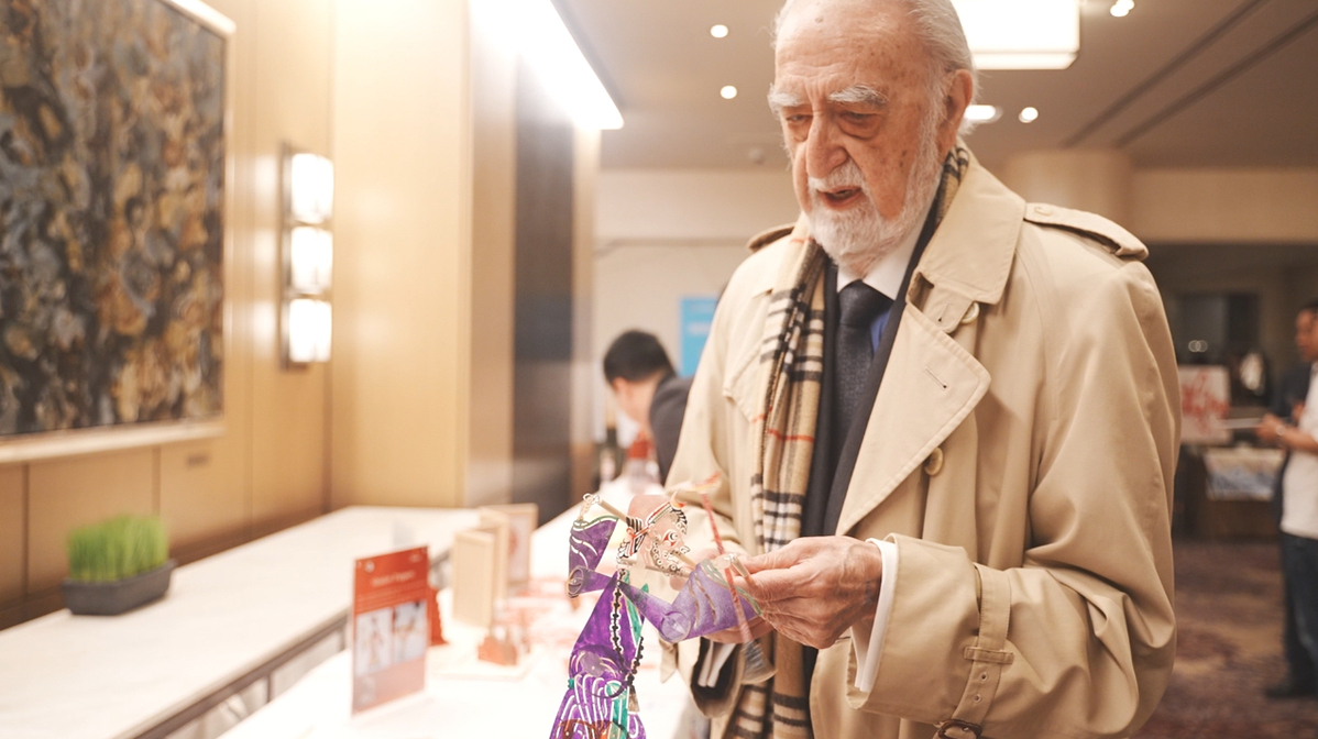 Manos Angelakis displays a shadow puppet, an intangible cultural heritage of Shaanxi province, at a Shaanxi cultural and tourism promotion event on Tuesday in New York. JIANG LAI / CHINA DAILY
