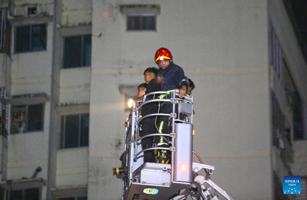 Firefighters conduct rescue work at the site of a building fire in Dhaka, Bangladesh, on Feb. 29, 2024. At least 43 people were killed Thursday night after a devastating fire tore through a high-rise building in the Bangladeshi capital of Dhaka. (Xinhua)