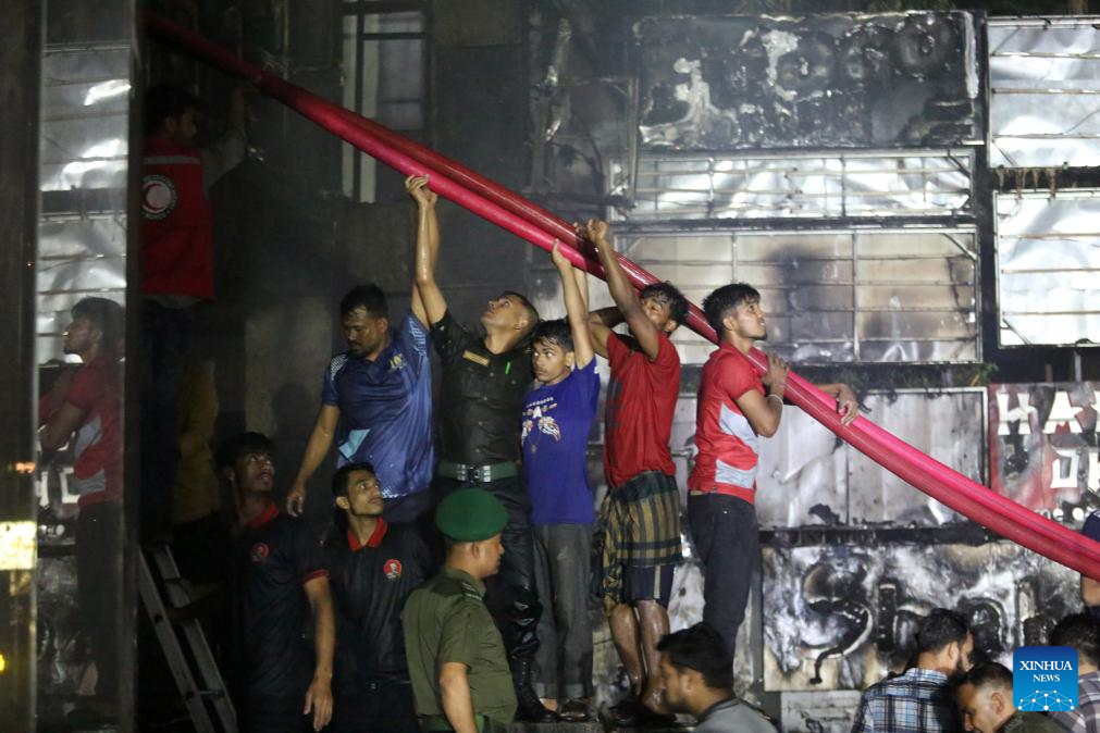 People help firefighters to battle a fire raging on a commercial building in Dhaka, Bangladesh, on Feb. 29, 2024. At least 43 people were killed Thursday night after a devastating fire tore through a high-rise building in the Bangladeshi capital of Dhaka. (Xinhua)