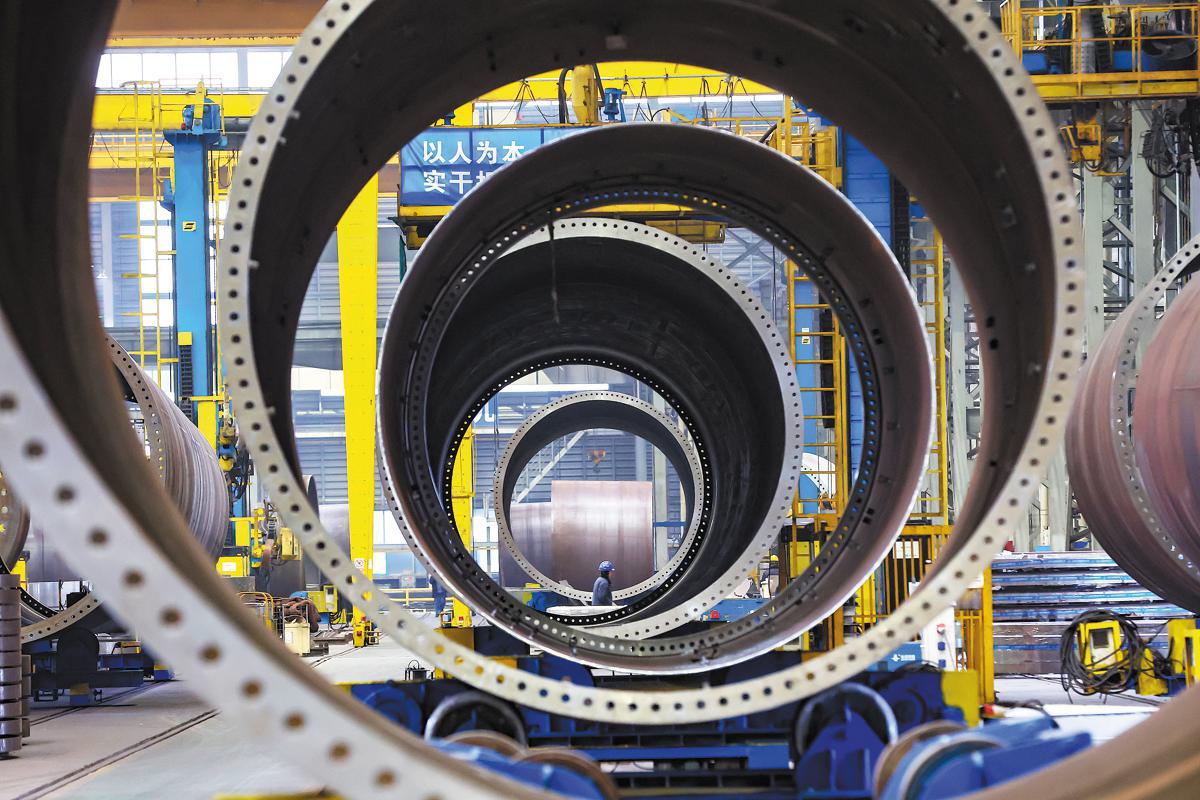 An employee of an engineering equipment manufacturer in Nanjing, Jiangsu province, works on Thursday at the company's production line. YANG BO / CHINA NEWS SERVICE