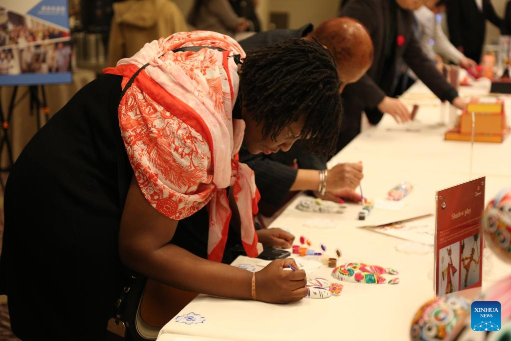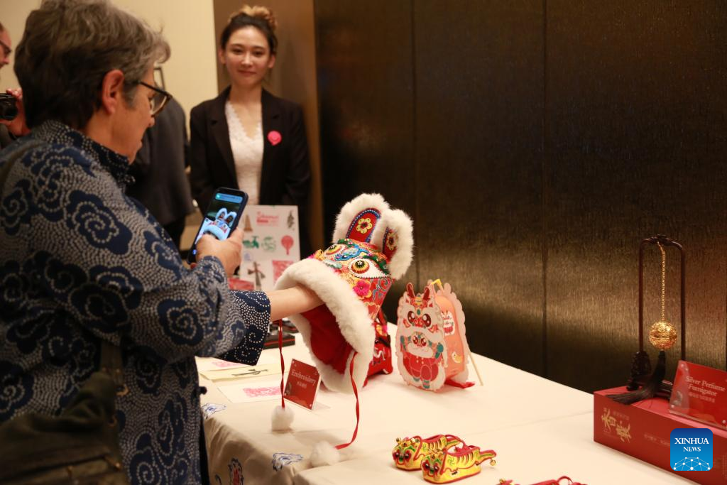 A woman takes pictures of a folk product at an event promoting culture and tourism for China's Shaanxi Province in New York City, the United States, on Feb. 27, 2024. (Xinhua/Liu Yanan)