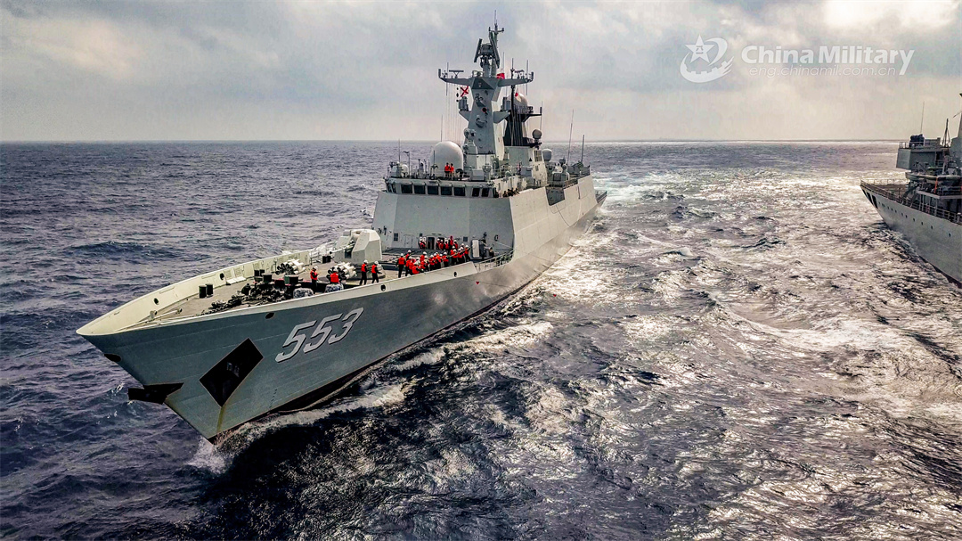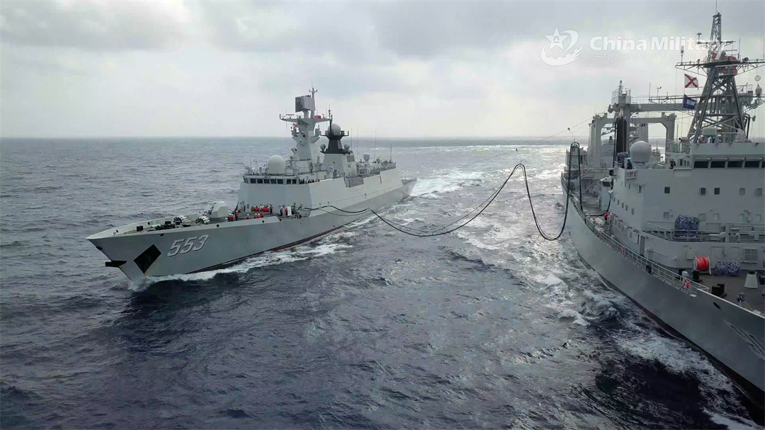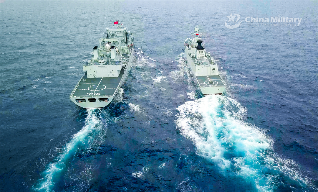 The guided-missile frigate Shaoguan and the comprehensive supply ship Honghu attached to a PLA naval flotilla perform alongside replenishment-at-sea during a recent maritime training exercise. (eng.chinamil.com.cn/Photo by Yu Chuanjun)