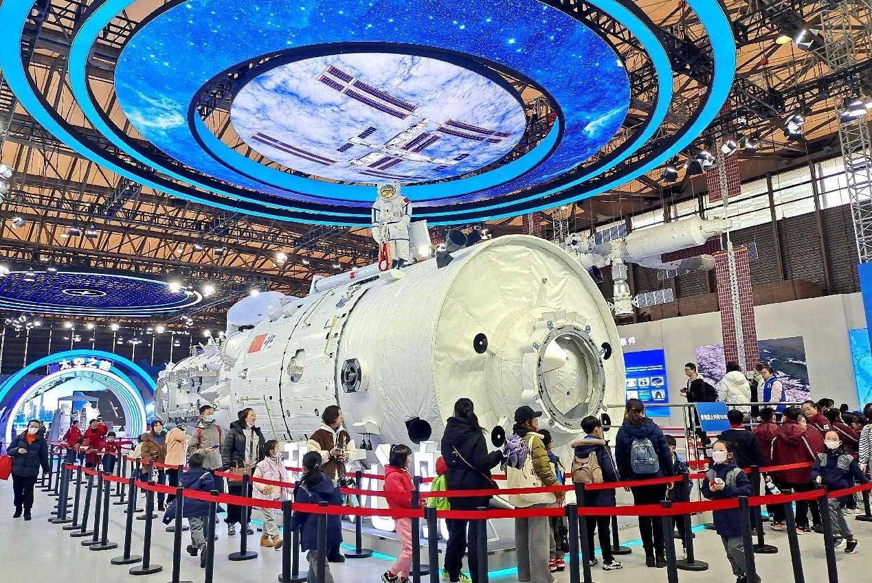 People visit an exhibition of achievements in China's manned spaceflight program at the Shanghai New International Expo Center, Shanghai, Jan. 18, 2024. (People's Daily Online/Yan Daming)