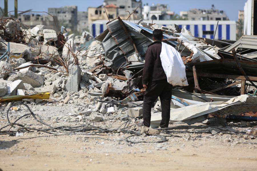 A man stands in front of destroyed buildings at Al-Maghazi refugee camp in central Gaza Strip, on Feb. 28, 2024. (Xinhua)