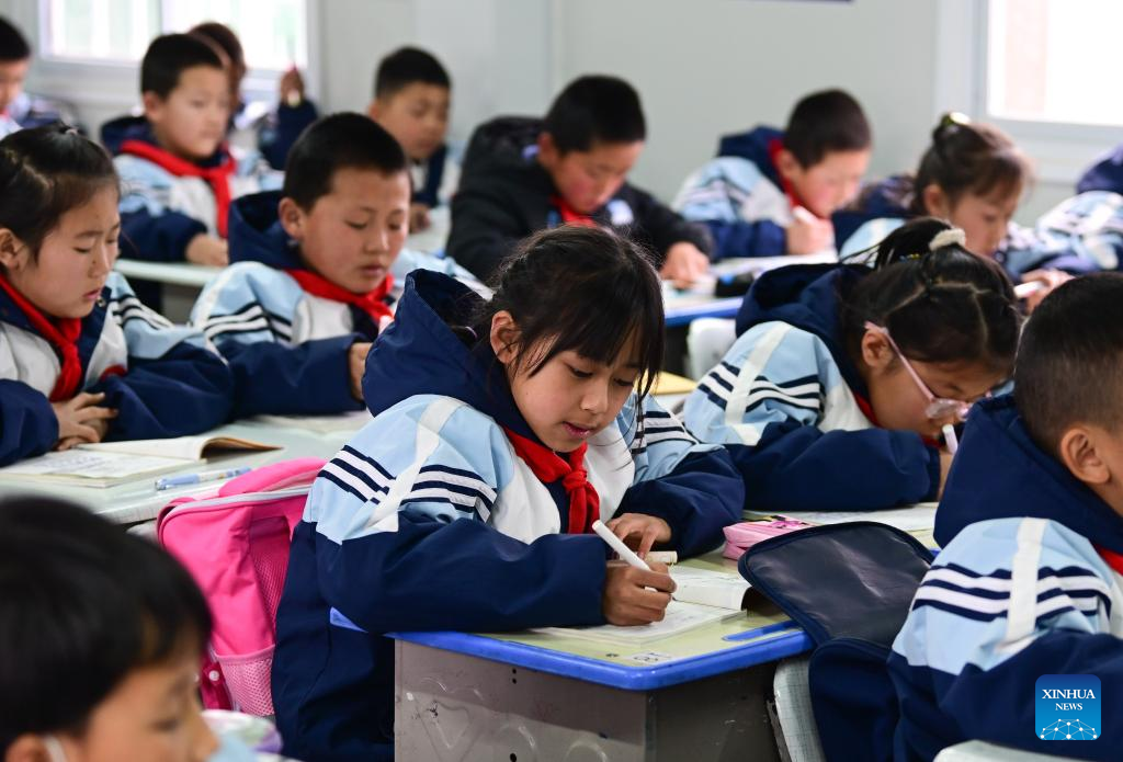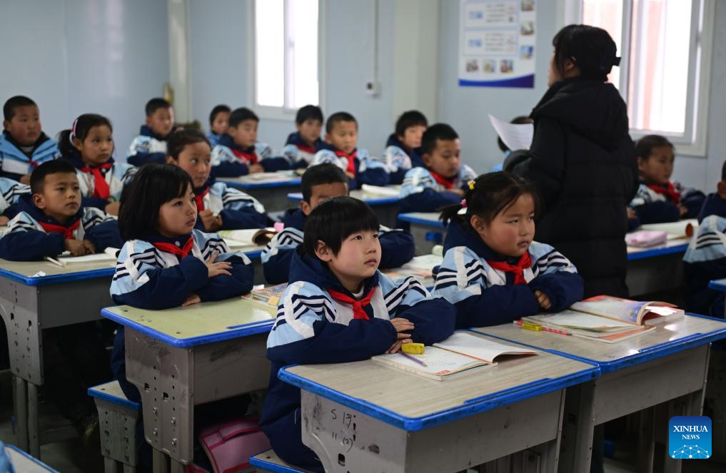Students have a class in a prefabricated classroom in Guanting Town, Minhe Hui and Tu Autonomous County, northwest China's Qinghai Province, March 1, 2024. So far, all middle schools and primary schools in Qinghai Province affected by a 6.2-magnitude earthquake that struck neighboring Gansu Province on Dec. 18, 2023 have started the new semester.