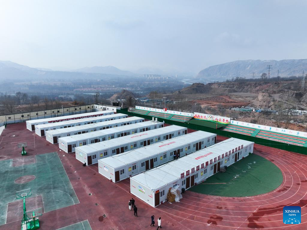 An aerial drone photo taken on March 1, 2024 shows prefabricated classrooms in Guanting Town, Minhe Hui and Tu Autonomous County, northwest China's Qinghai Province. So far, all middle schools and primary schools in Qinghai Province affected by a 6.2-magnitude earthquake that struck neighboring Gansu Province on Dec. 18, 2023 have started the new semester.