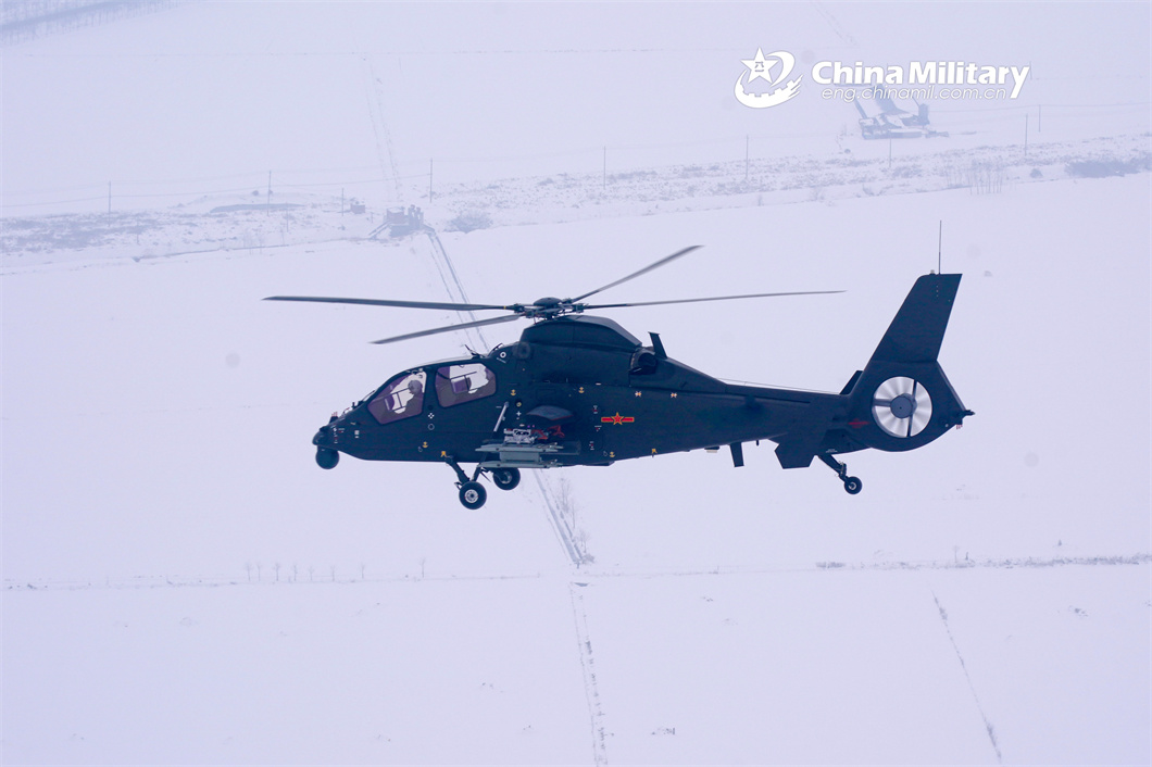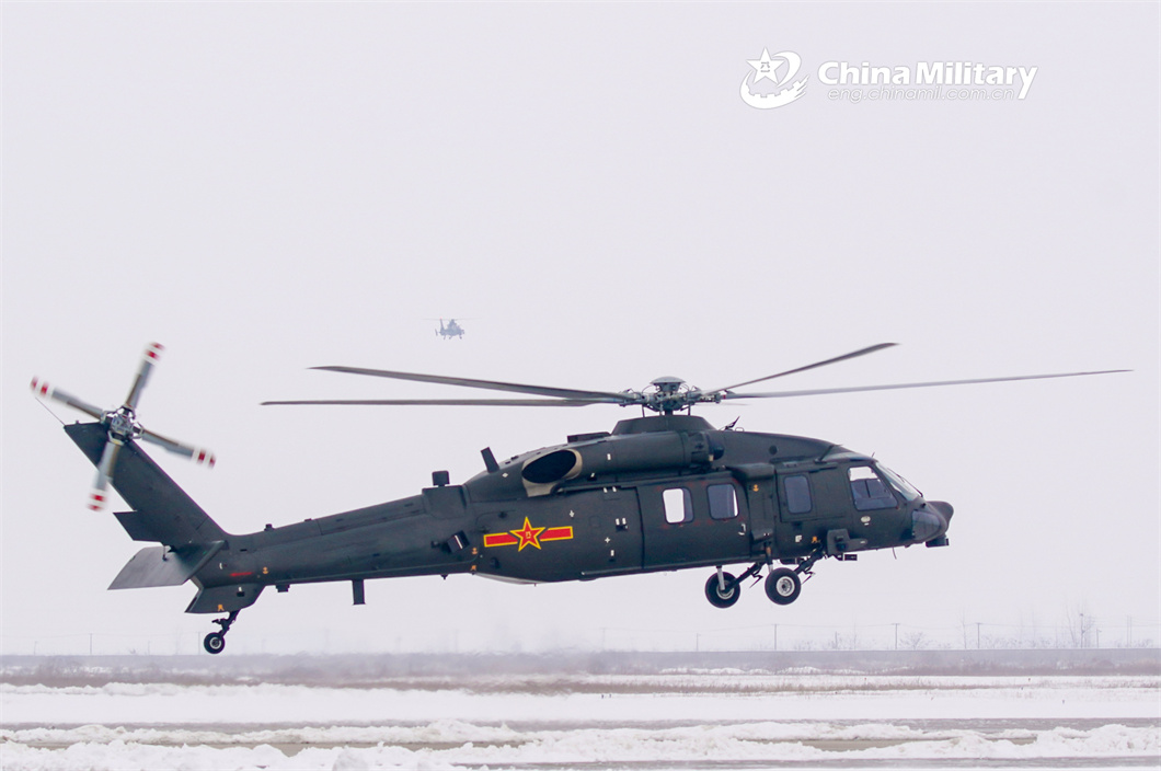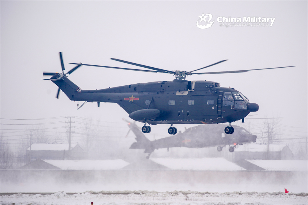A helicopter attached to a brigade under the PLA 71st Group Army lifts off for a training mission after snow on February 20, 2024. The mission aimed to beef up the pilots' rapid response and special situation handling capabilities. (eng.chinamil.com.cn/Photo by Li Jingyou)