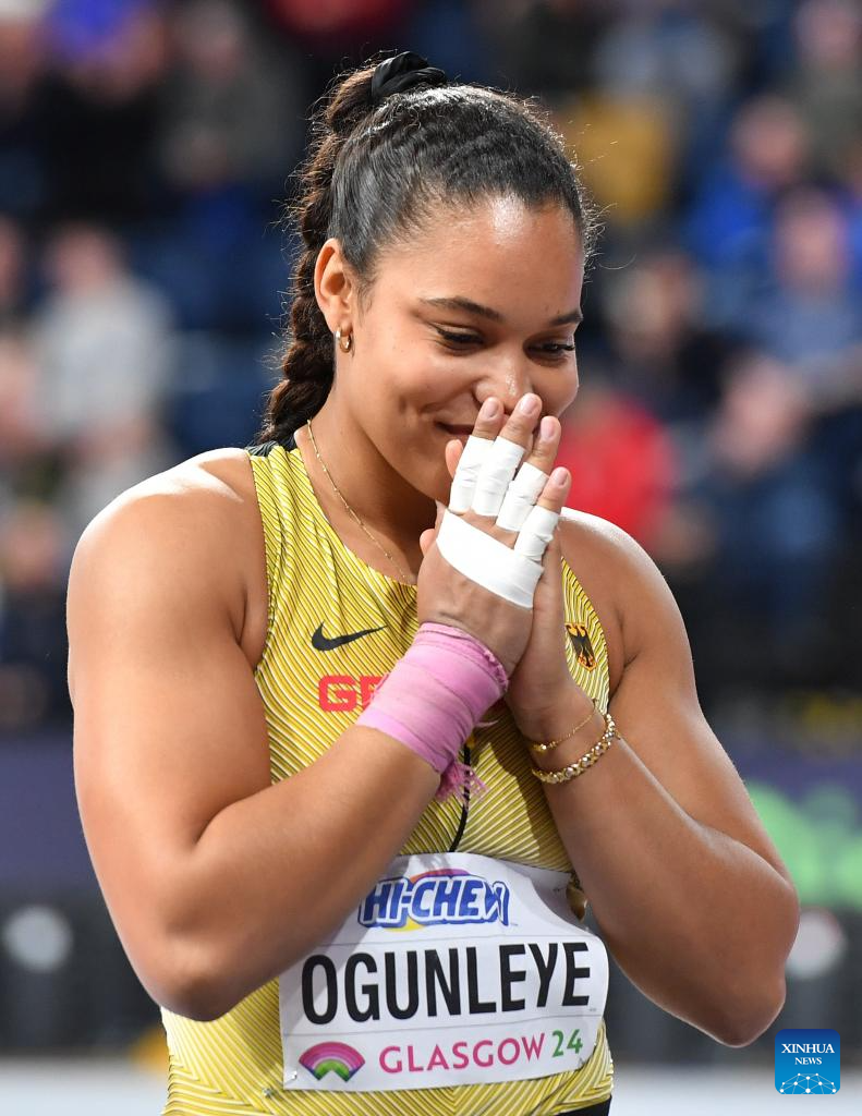 Yemisi Ogunleye of Germany reacts during the women's shot put final of the 2024 World Athletics Indoor Championships in Glasgow, Britain, March 1, 2024. (Photo by Mark Runnacles/Xinhua)