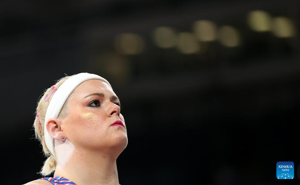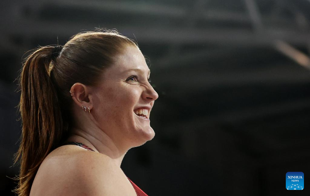 Sarah Mitton of Canada reacts during the women's shot put final of the 2024 World Athletics Indoor Championships in Glasgow, Britain, March 1, 2024. (Xinhua/Li Ying)