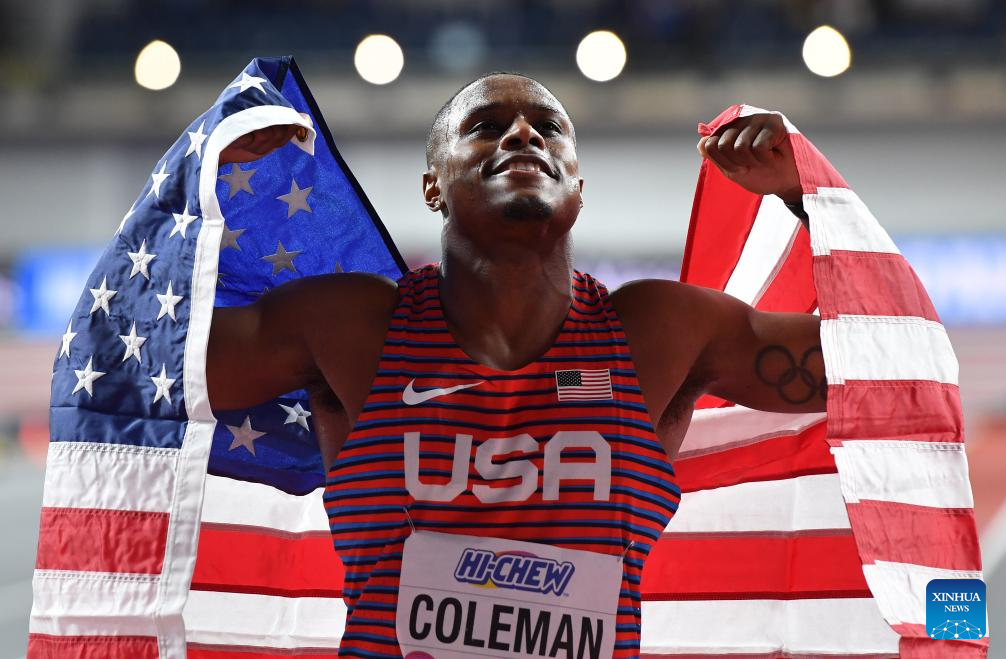 Christian Coleman of the United Statas celebrates winning the men's 60m final of the 2024 World Athletics Indoor Championships in Glasgow, Britain, March 1, 2024. (Photo by Mark Runnacles/Xinhua)