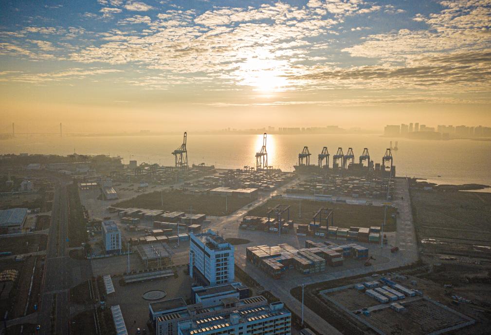 An aerial drone photo taken on Jan. 1, 2024 shows the Yangpu international container terminal in south China's Hainan Province. (Xinhua/Pu Xiaoxu)