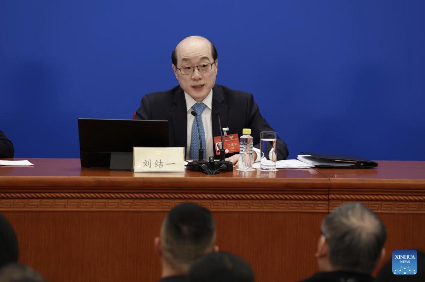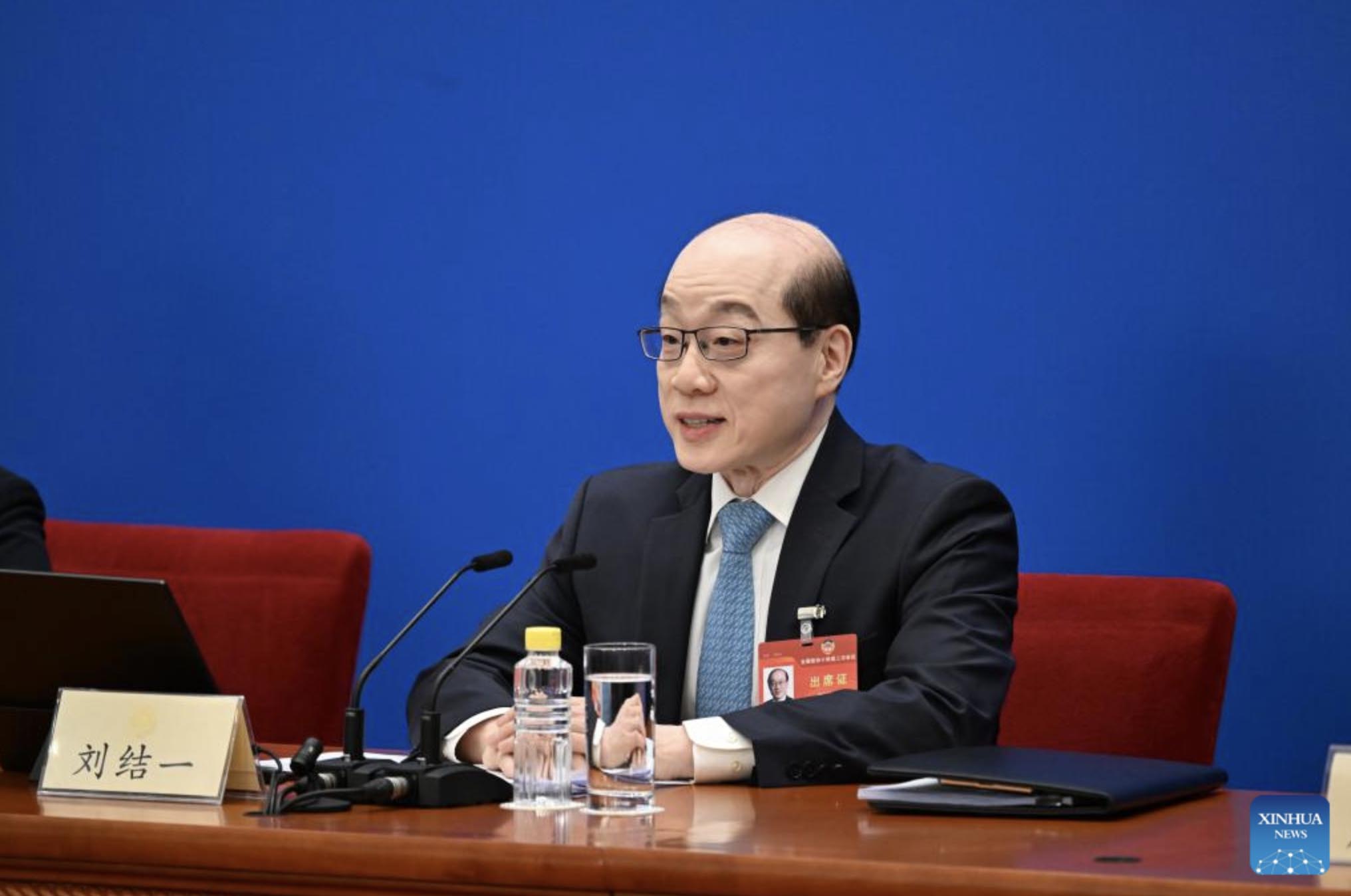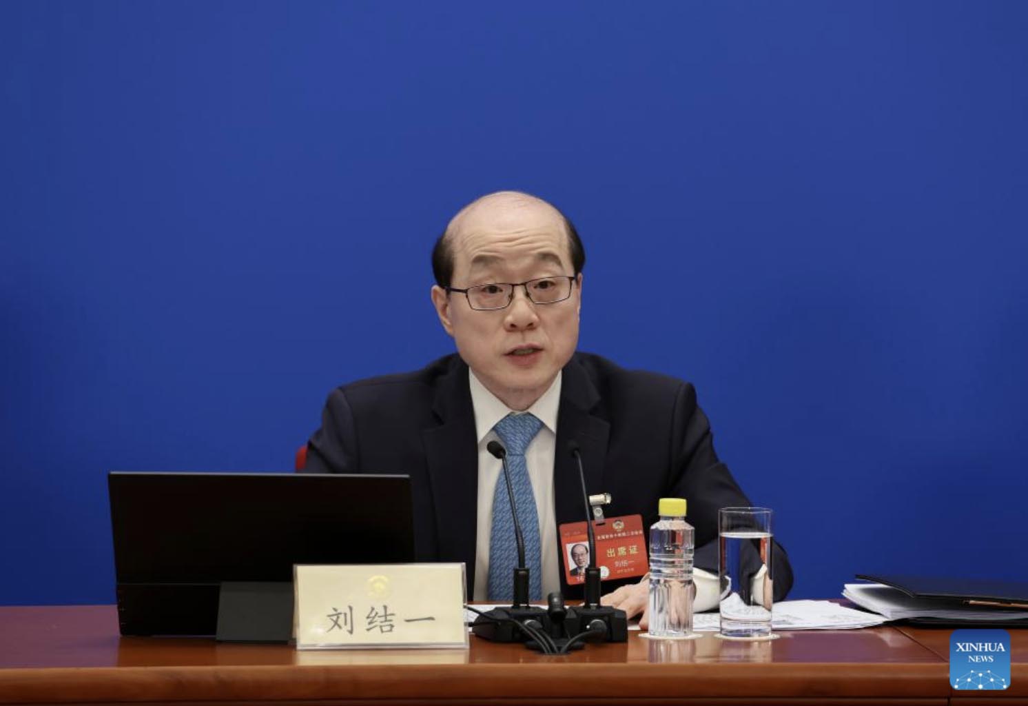 Liu Jieyi, spokesperson for the second session of the 14th Chinese People's Political Consultative Conference (CPPCC) National Committee, attends a press conference at the Great Hall of the People in Beijing, capital of China, March 3, 2024. The CPPCC National Committee, China's top political advisory body, held a press conference on Sunday, one day ahead of its annual session. (Xinhua/Chen Yehua)