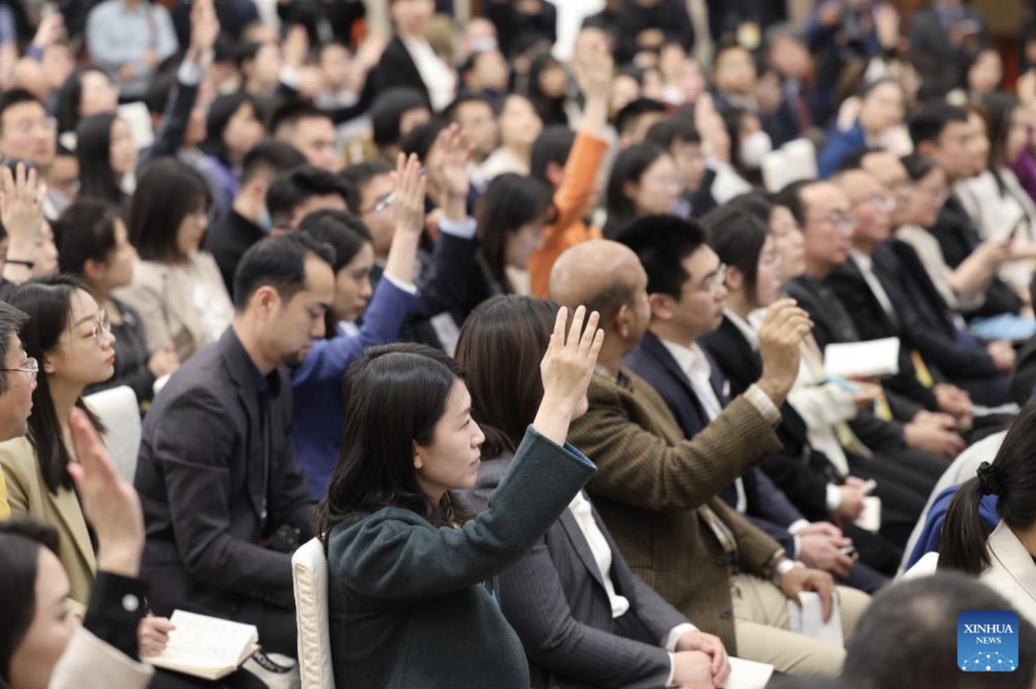 Journalists raise hands to ask questions at a press conference of the second session of the 14th National Committee of the Chinese People's Political Consultative Conference (CPPCC) at the Great Hall of the People in Beijing, capital of China, March 3, 2024. The CPPCC National Committee, China's top political advisory body, held a press conference on Sunday, one day ahead of its annual session. (Xinhua/Jin Liwang)