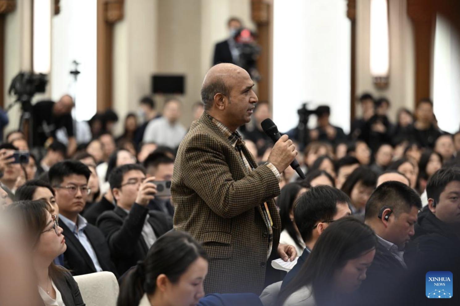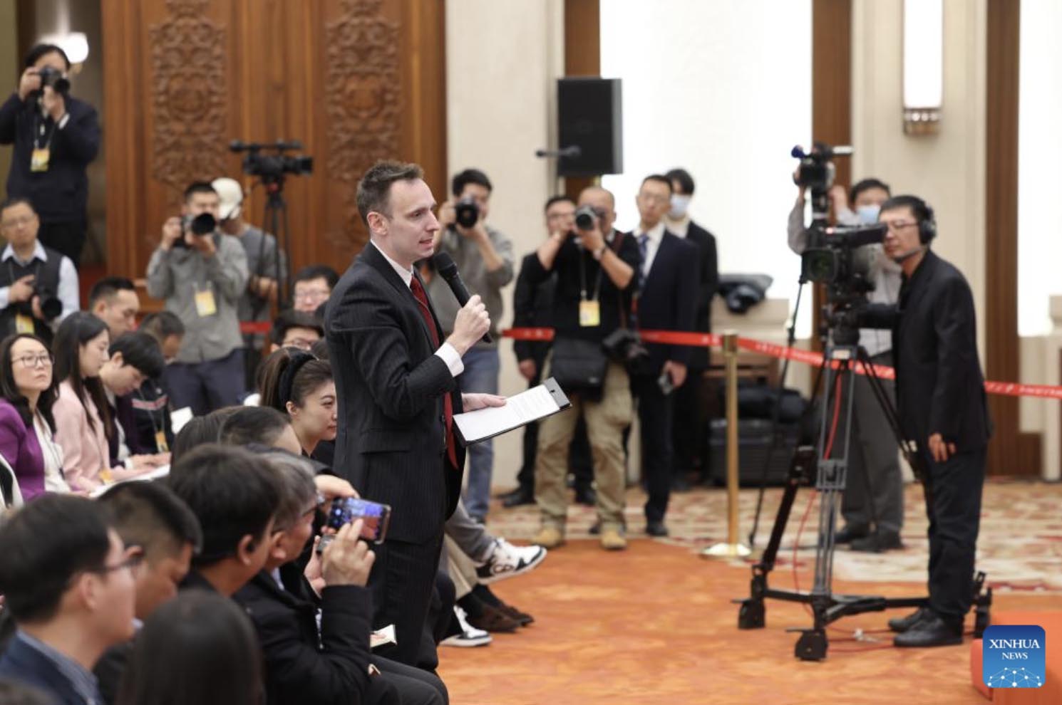 A journalist asks a question at a press conference of the second session of the 14th National Committee of the Chinese People's Political Consultative Conference (CPPCC) at the Great Hall of the People in Beijing, capital of China, March 3, 2024. The CPPCC National Committee, China's top political advisory body, held a press conference on Sunday, one day ahead of its annual session. (Xinhua/Xing Guangli)