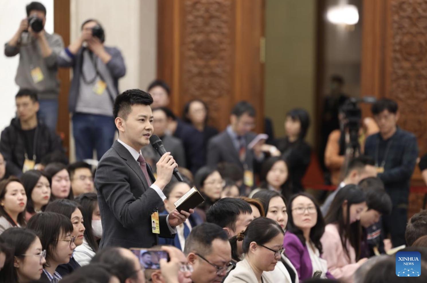 A journalist asks a question at a press conference of the second session of the 14th National Committee of the Chinese People's Political Consultative Conference (CPPCC) at the Great Hall of the People in Beijing, capital of China, March 3, 2024. The CPPCC National Committee, China's top political advisory body, held a press conference on Sunday, one day ahead of its annual session. (Xinhua/Chen Yehua)