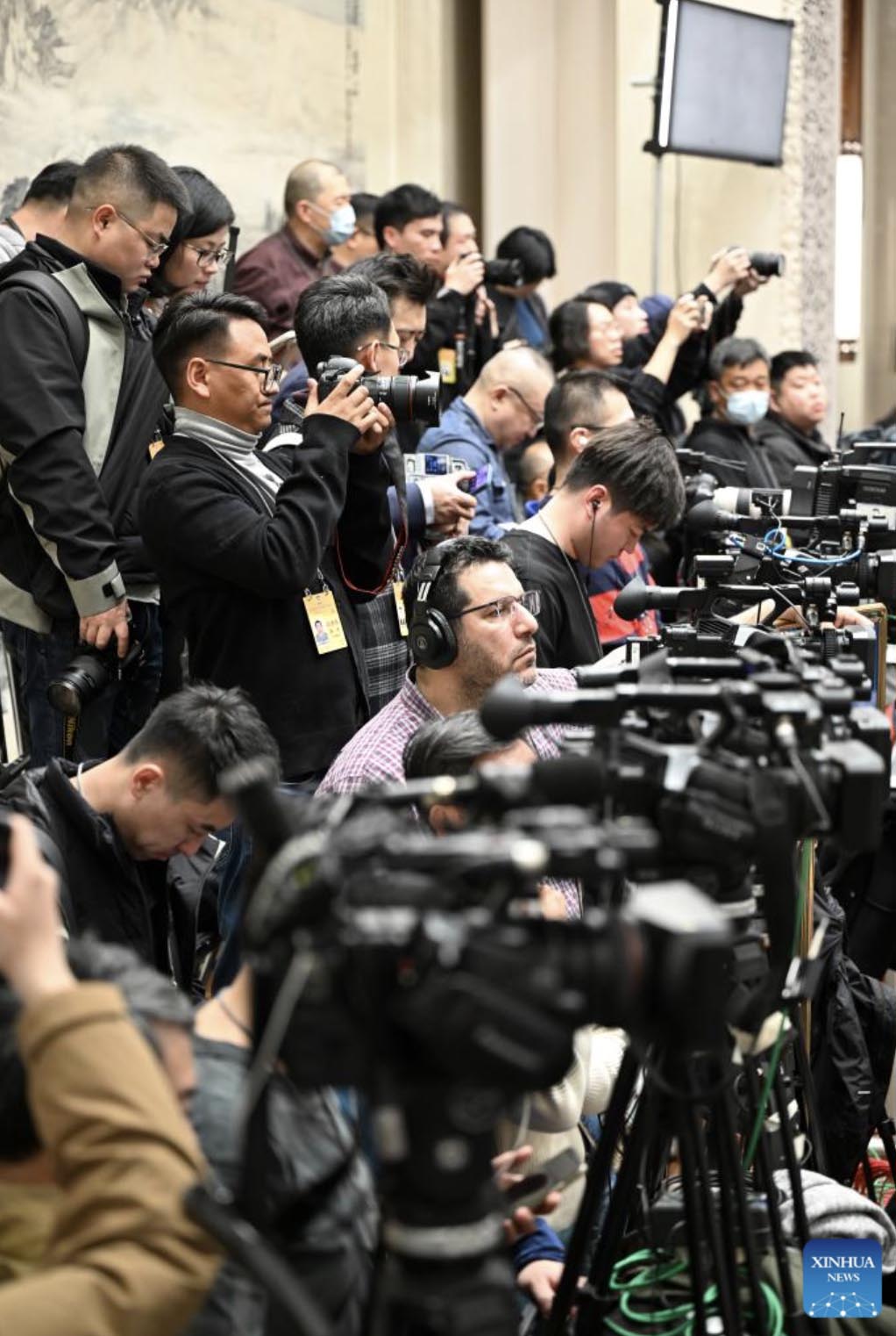 Journalists work at a press conference of the second session of the 14th National Committee of the Chinese People's Political Consultative Conference (CPPCC) at the Great Hall of the People in Beijing, capital of China, March 3, 2024. The CPPCC National Committee, China's top political advisory body, held a press conference on Sunday, one day ahead of its annual session. (Xinhua/Chen Yehua)