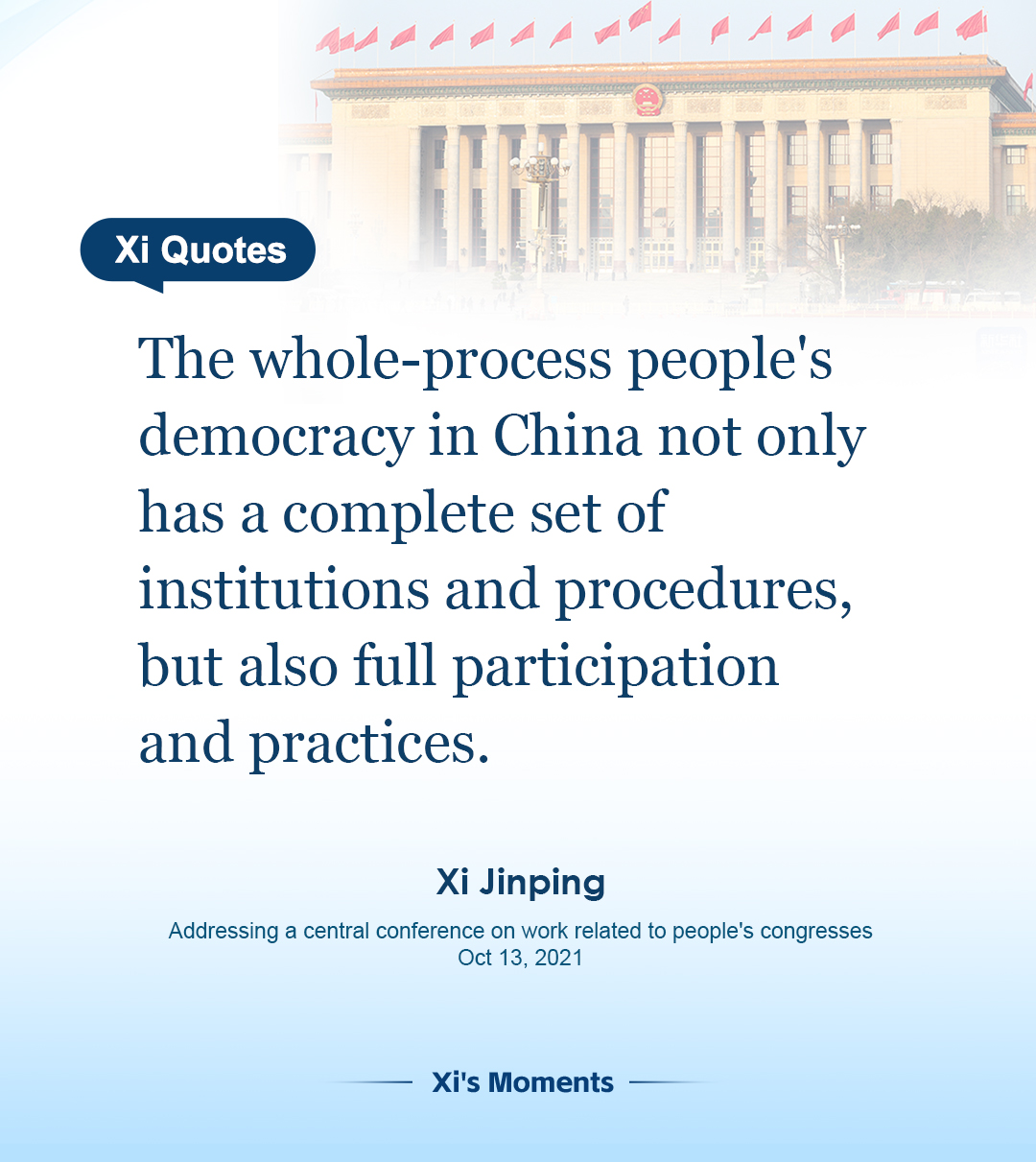 The annual sittings of China's top legislature and top political advisory body, or the two sessions, offer a window into the nation's practice of whole-process people's democracy. Here are some of President Xi Jinping's key remarks about whole-process people's democracy.