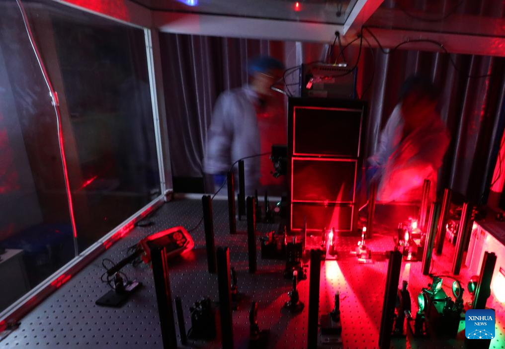 Researchers perform an experiment at a laboratory in the Shanghai Institute of Optics and Fine Mechanics, Chinese Academy of Sciences in east China's Shanghai, Feb. 29, 2024. (Xinhua/Jin Liwang)