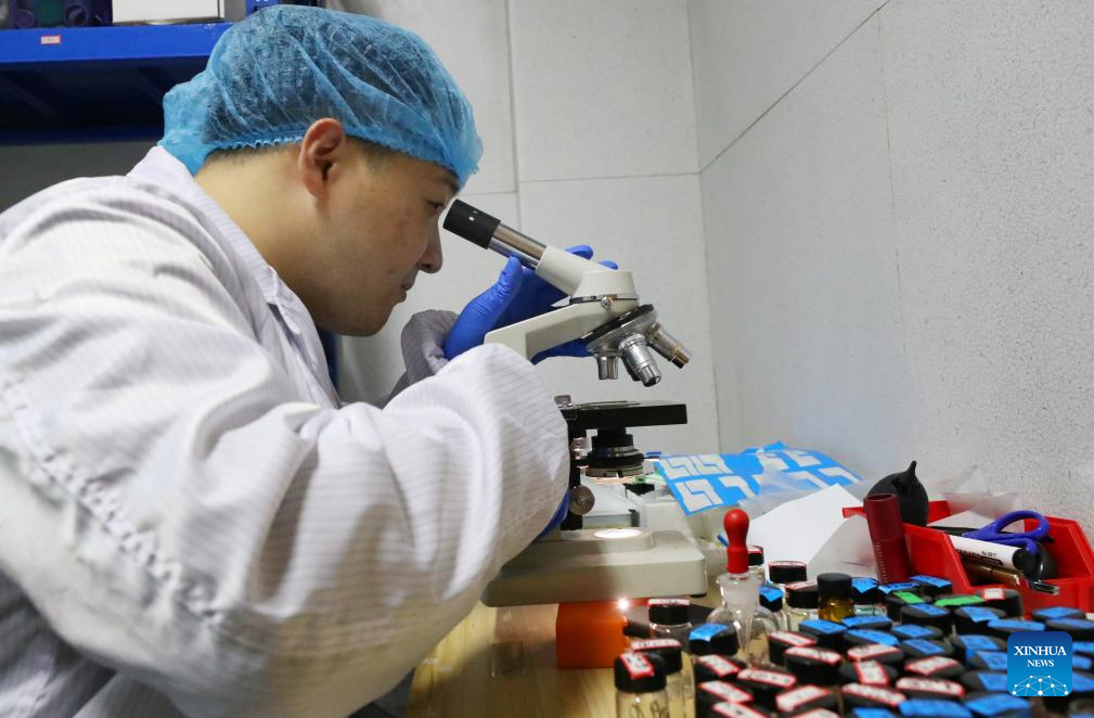 Researcher Zhao Miao observes experiment materials at a laboratory in the Shanghai Institute of Optics and Fine Mechanics, Chinese Academy of Sciences in east China's Shanghai, Feb. 29, 2024. (Xinhua/Jin Liwang)