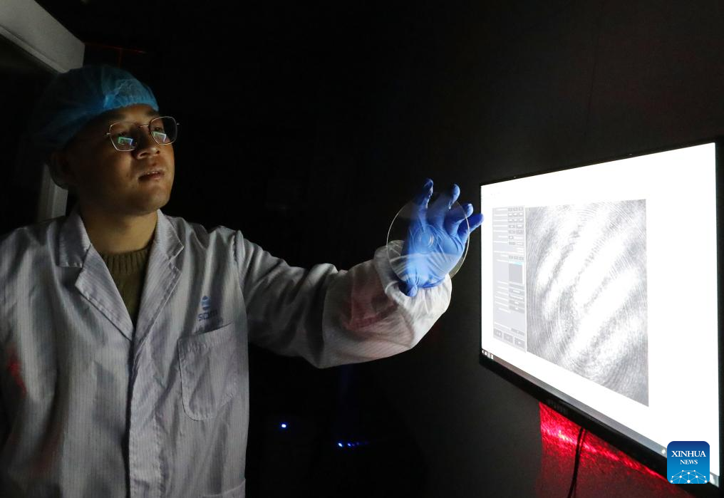 Researcher Zhao Miao shows a three-dimensional nanoscale optical disk memory with petabit capacity at a laboratory in the Shanghai Institute of Optics and Fine Mechanics, Chinese Academy of Sciences in east China's Shanghai, Feb. 29, 2024. (Xinhua/Fang Zhe)