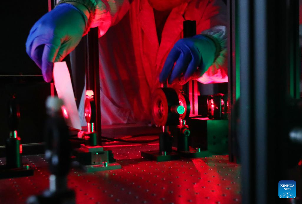 Researchers perform an experiment at a laboratory in the Shanghai Institute of Optics and Fine Mechanics, Chinese Academy of Sciences in east China's Shanghai, Feb. 29, 2024. (Xinhua/Fang Zhe)