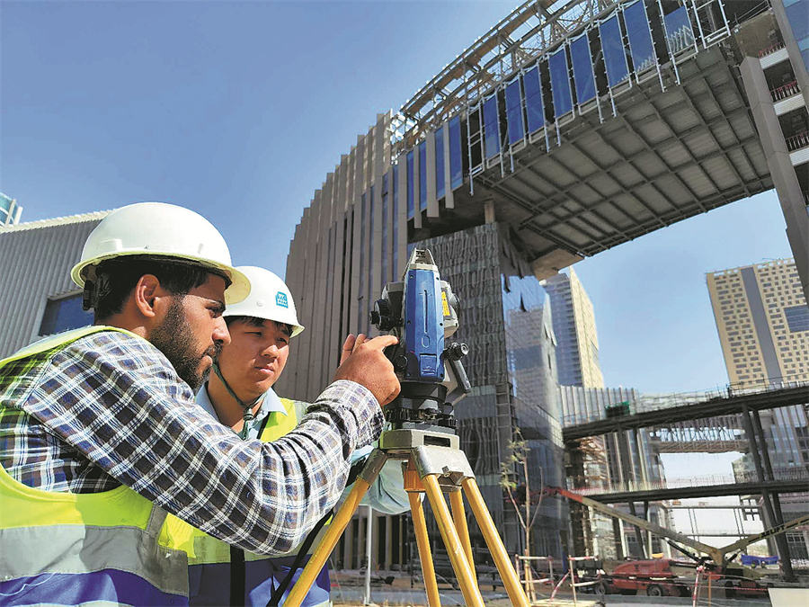 Chinese and Egyptian builders work together to measure a building under construction in the central business district in New Cairo, the African country's new administrative capital area, in December. [Photo/Xinhua]