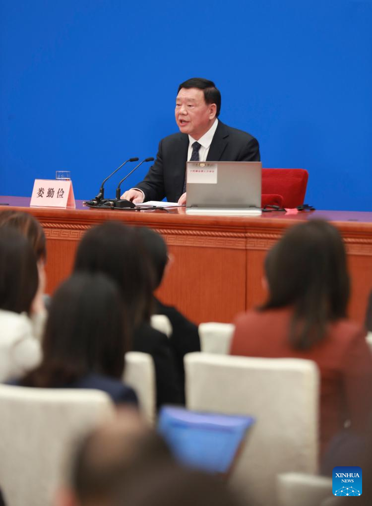 Lou Qinjian, spokesperson for the second session of the 14th National People's Congress (NPC), attends a press conference at the Great Hall of the People in Beijing, capital of China, March 4, 2024. The NPC, China's national legislature, held a press conference on Monday, one day ahead of the opening of its annual session. (Xinhua/Mu Yu)
