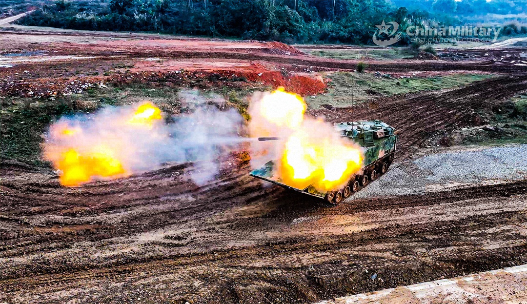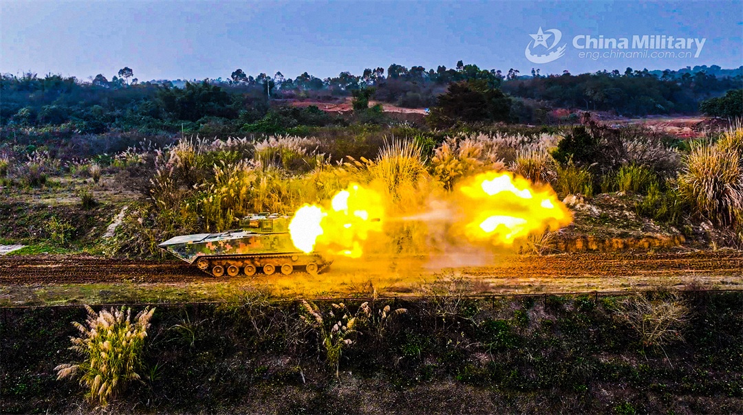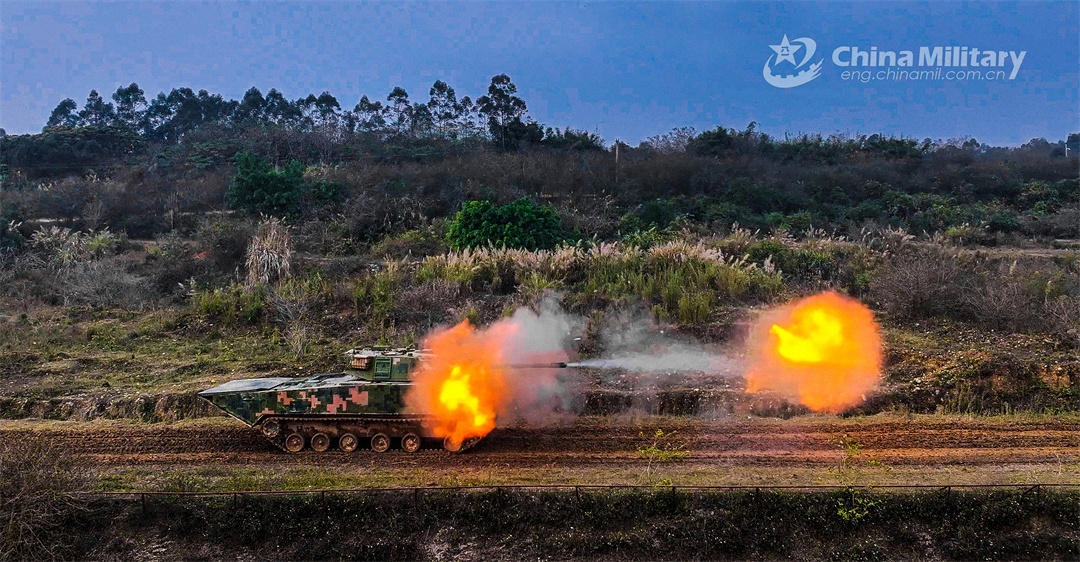 An armored vehicle attached to an armored detachment with an amphibious combined-arms brigade under the PLA 73rd Group Army fires at simulated targets during a shooting assessment in mid-February, 2024. The assessment focused on such subjects as crew coordination, firing during transient stop, and firing on the move, in order to test the combat effectiveness and precision strike capability of the troops. (eng.chinamil.com.cn/Photo by Liu Hao)