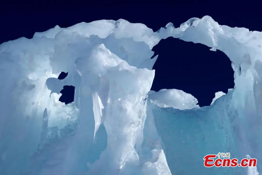 Clear ice is raised above the lake surface under the blue sky on Sayram Lake, the largest alpine lake in Bortala Mongolian Autonomous Prefecture, northwest China's Xinjiang Uygur Autonomous Region. (Photo: China News Service/Dai Yuanjian)