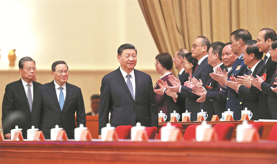 National political advisers applaud as President Xi Jinping, who is also general secretary of the Communist Party of China Central Committee, and other leaders enter the venue of the opening meeting of the second session of the 14th National Committee of the Chinese People's Political Consultative Conference in Beijing on Monday. [ZOU HONG/CHINA DAILY]