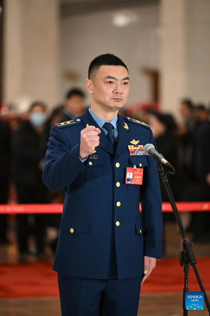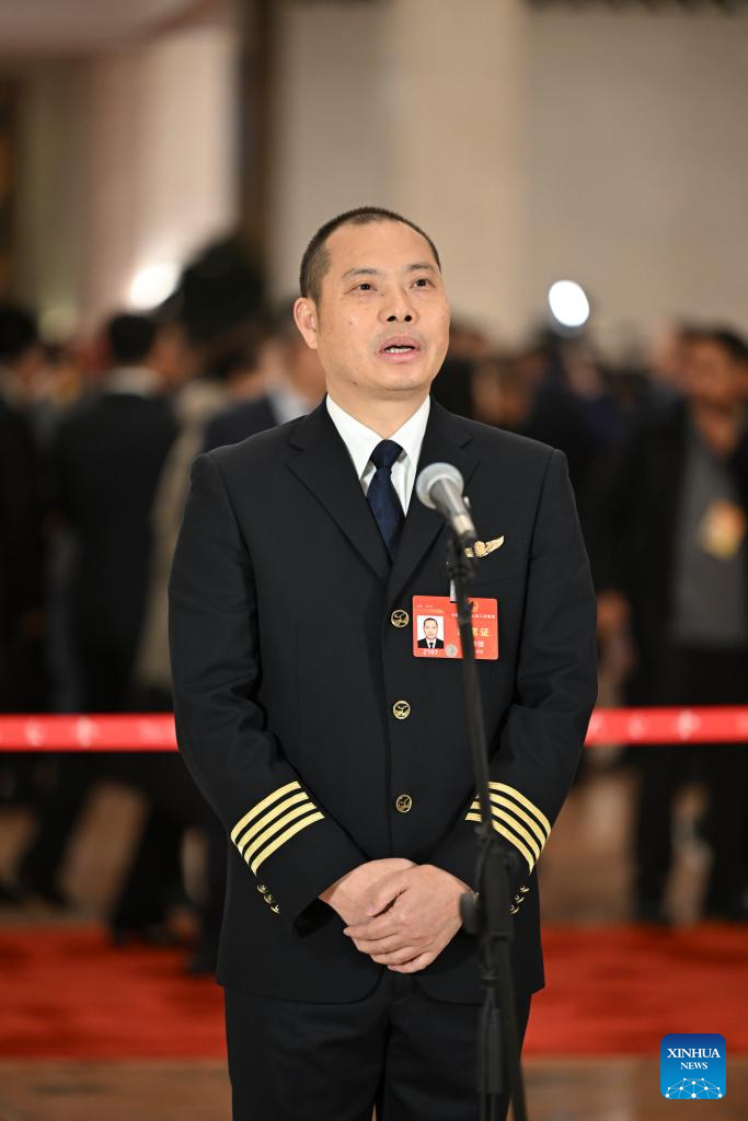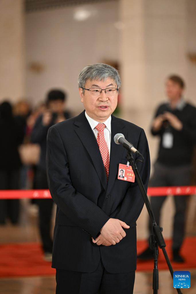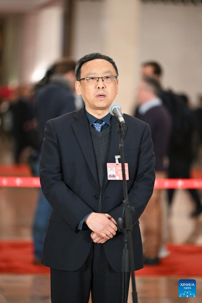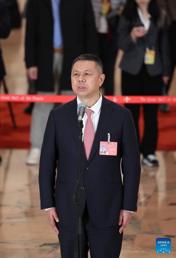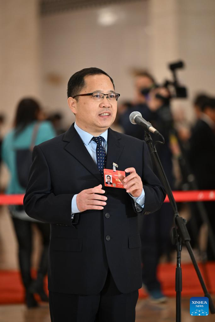 Liu Chuanjian, a deputy to the 14th National People's Congress (NPC), is interviewed ahead of the opening meeting of the second session of the 14th NPC at the Great Hall of the People in Beijing, capital of China, March 5, 2024. (Xinhua/Mu Yu)