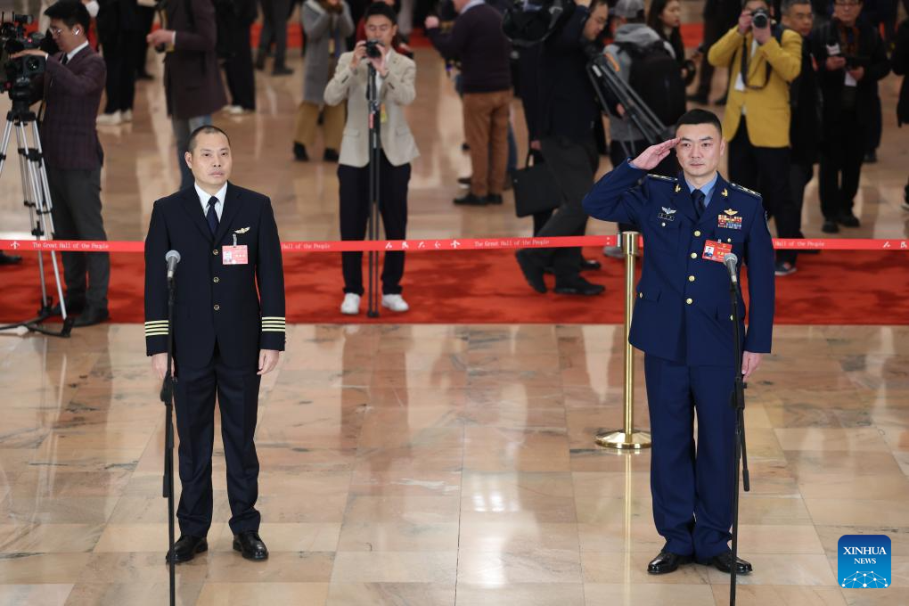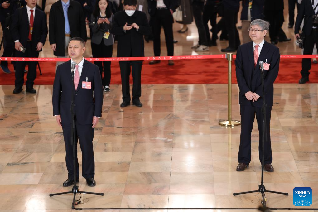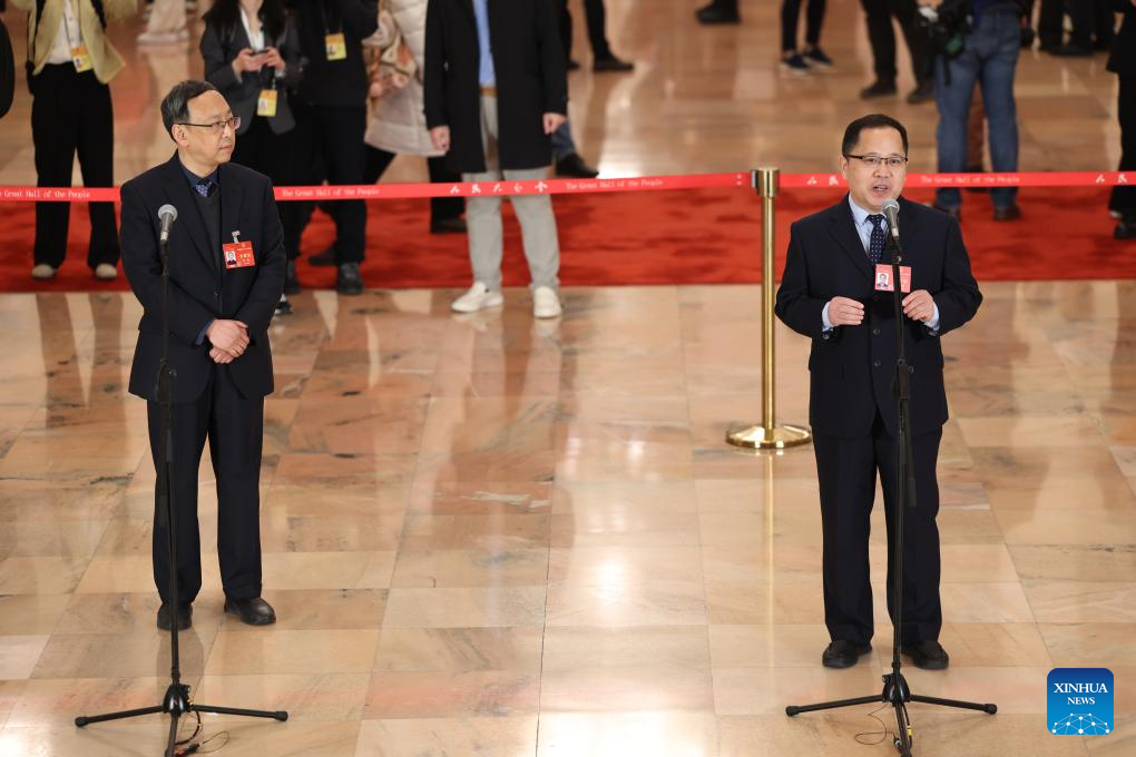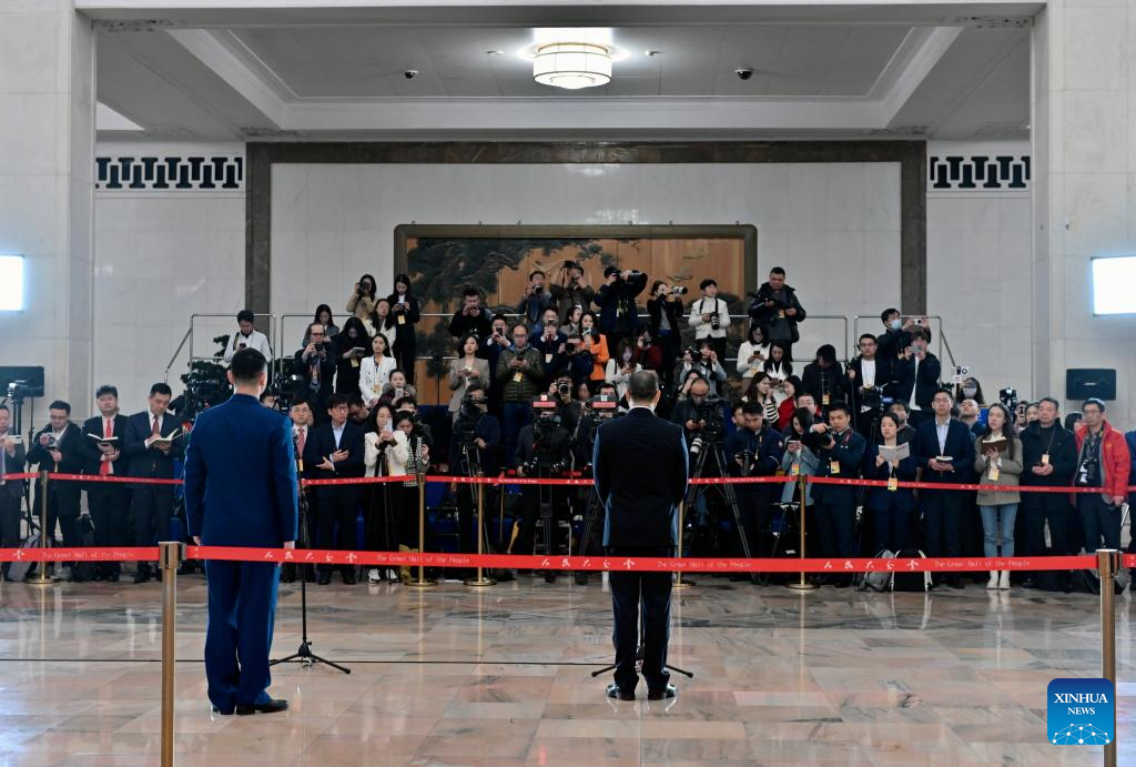 Deputies to the 14th National People's Congress (NPC) are interviewed ahead of the opening meeting of the second session of the 14th NPC at the Great Hall of the People in Beijing, capital of China, March 5, 2024. (Xinhua/Liu Xu)