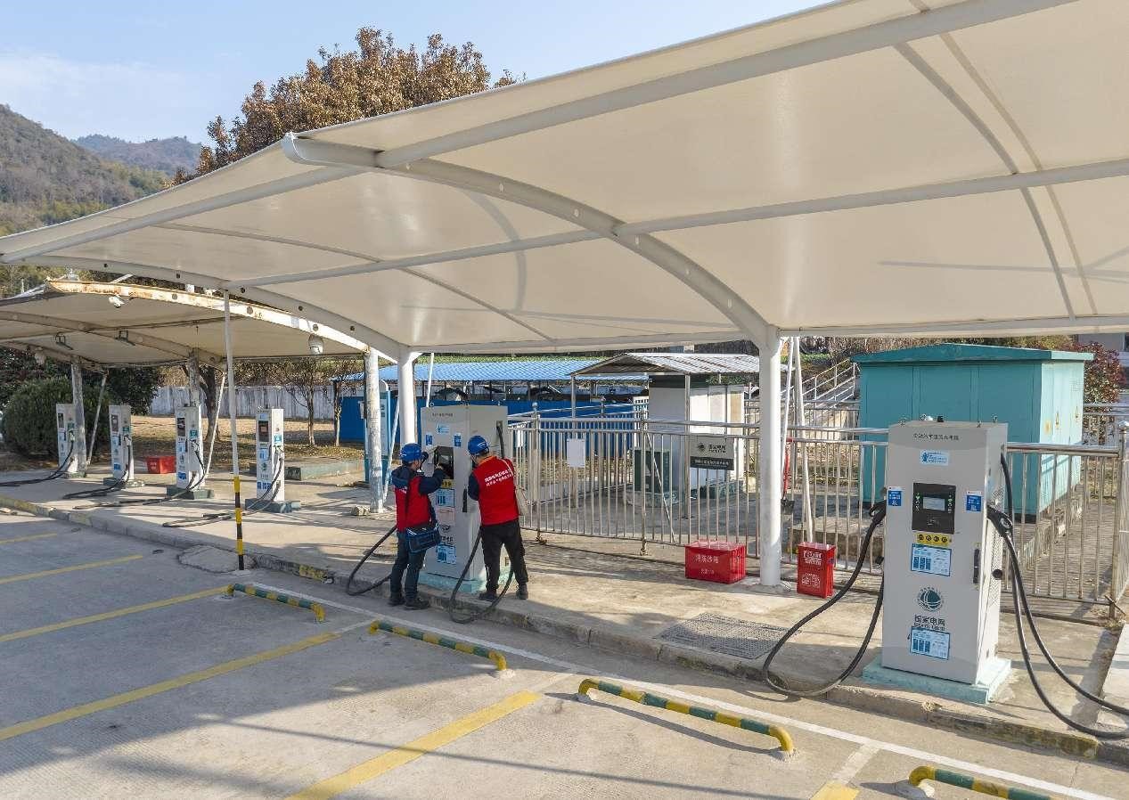 Technicians check the conditions of charging poles in a service area along the Nanjing-Wuhu Expressway in Wuhu, east China's Anhui province. (People's Daily Online/Xiao Benxiang)