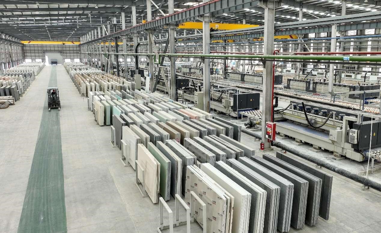 A worker drives a forklift in a workshop of an enterprise producing environmentally-friendly slabs in Hukou county, Jiujiang, east China's Jiangxi province. (People's Daily Online/Wu Jiang)